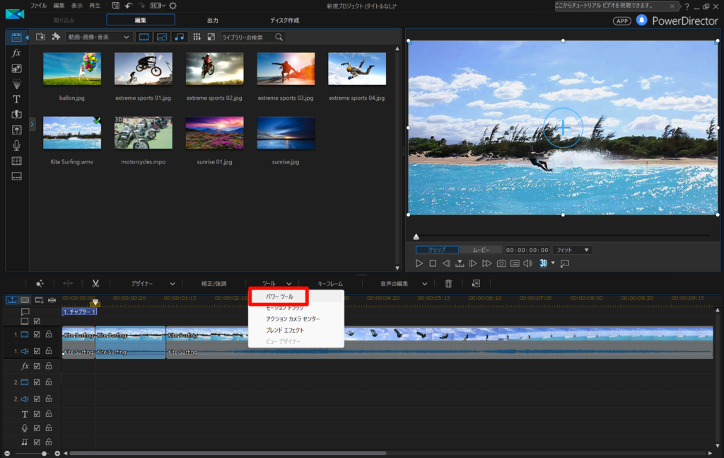 早送りしたい部分としない部分を分割したことで切り出せた部分を選択し、ツールのプルダウンを開きパワーツールを選択します。