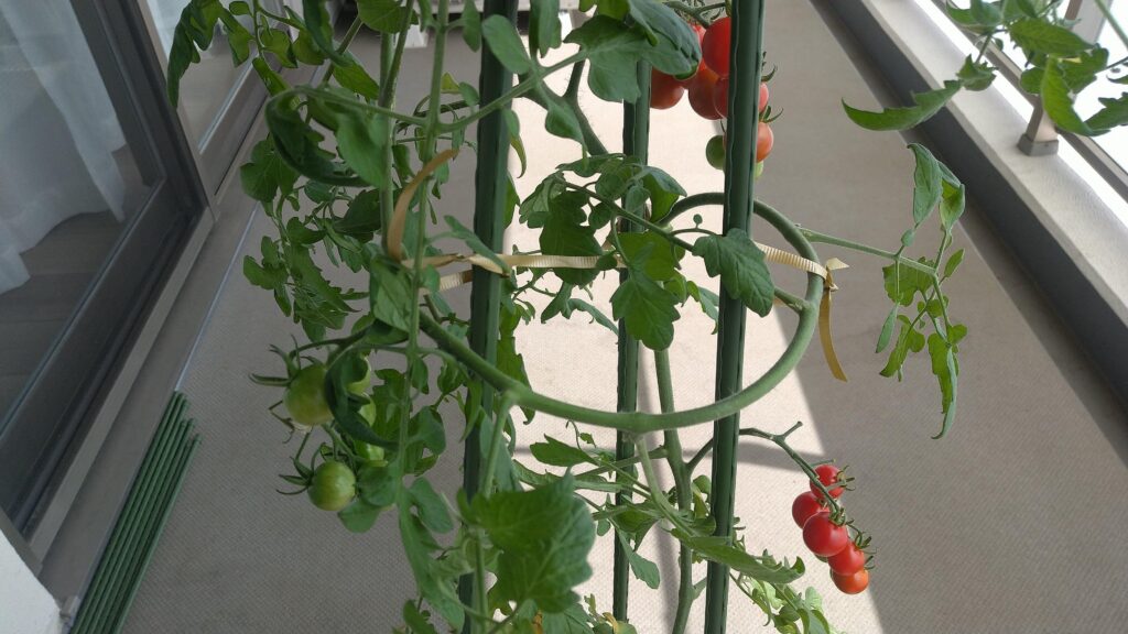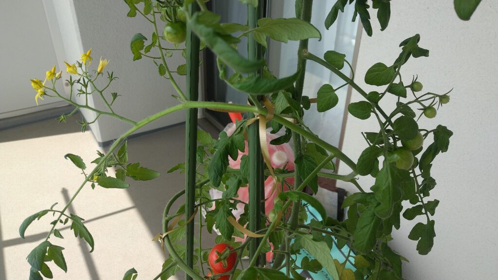 ミニトマトの栽培(12週目) キノコバエ駆除途中・枝が伸びるため支柱に巻きつける