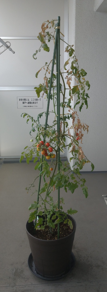 枝は若干枯れはじめ緑の葉も水々しさを失い苗から概ね3ヶ月というミニトマトの寿命を感じますが、まだ実をつけているためもう少し頑張ってもらいます。