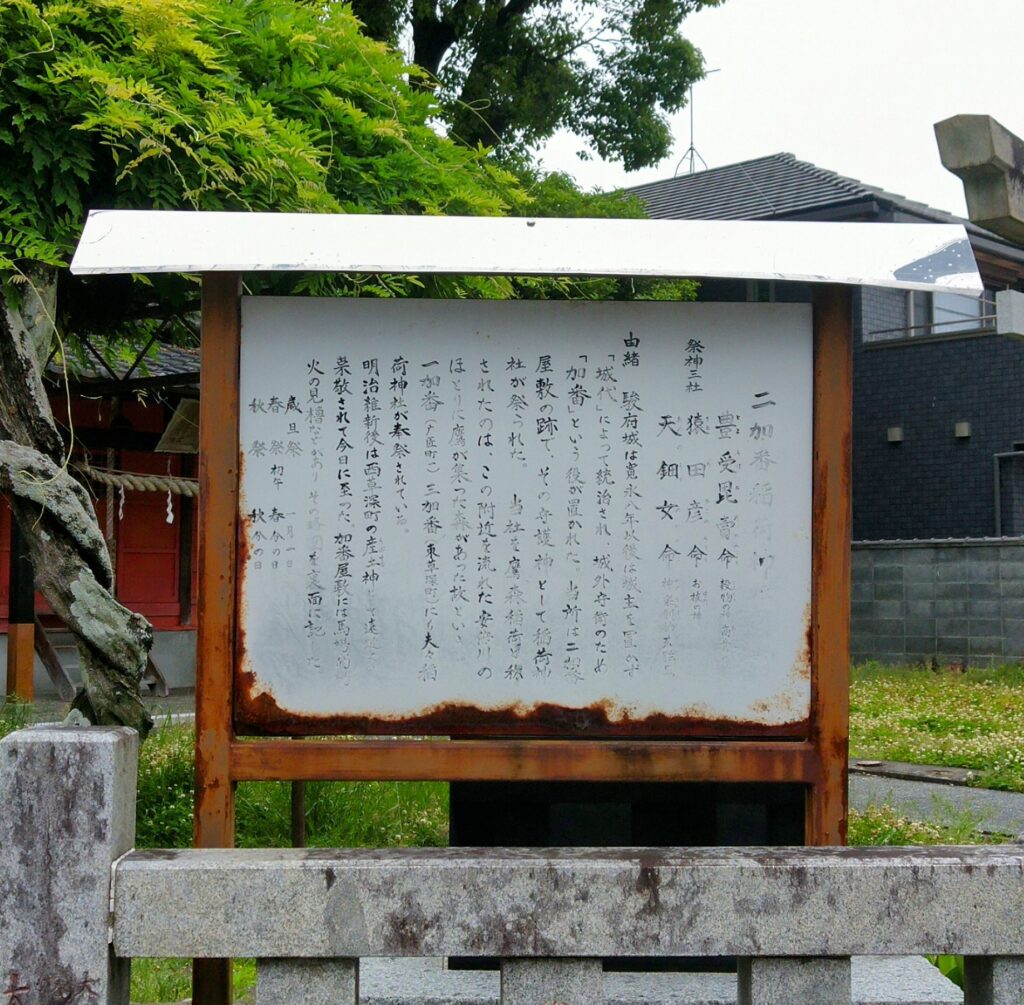 案内板によると、二加番の屋敷跡であるこの地に守護神として稲荷社が祀られたとのことです。